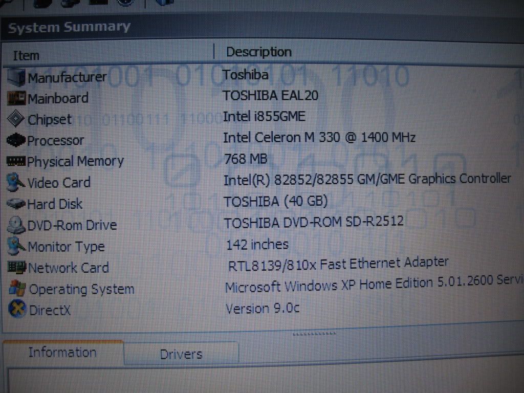 QUI una schermata con le caratteristiche( cambia solo l'hard disk che e' stato cambiato e messo uno da 160gb 5400rpm) QUESTO e' il portatile in questione. -ha presente il cd di ripristino sistema,licenza xp originale e bitdefender internet security 2011 originale con 520 giorni di licenza rimanenti,caricabatterie originale e CARICABATTERIA DA AUTO(pagato da solo 40 euro),borsa per il trasporto.IL PORTATILE E PERFETTAMENTE FUNZIONANTE E INTEGRO In regalo scheda pcmcia wi-fi QUESTA aggiungo in regalo una webcam da 1mpx se non ricordo male con microfono integrato Prezzo di vendita...... VENDUTO A lionard REGOLE: -code veloci,se passano 12h passo oltre -precedenza a mano se venite voi a prenderlo -in vendita anche su altri lidi -posso ritirarlo dalla vendita (avvisando giustamente le persone in coda) -pagamento preferito postepay,accetto anche bonifico ma ci vorra' 2 giorni in + per spedire,anche paypal se vi pagate le comissioni -la spedizione la scegliete voi,se non volete assicurata non rispondo dei danni durante il trasporto,io mi impegno di fare un pacco ben imbottito