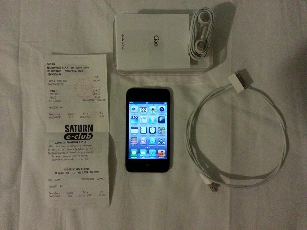 Salve ragazzi, vendo fantastico Apple Ipod Touch 4G da 16gb. Essi è stato acquistato poco più di un mese fa per l'esattezza 1/marzo/2013 come si evince dalla foto dello scontrino fiscale. Acquistato in noto shop al prezzo di 219 euro. E' ancora immacolato, trattato come un gioiellino, non ha nemmeno un graffio sia nella parte cromata posteriore, sia nello schermo. Lo vendo compreso di tutti gli accessori originali: cuffie apple (mai utilizzate), cavetto apple per il collegamento al pc e l'ipod. Vendo causa inutilizzo per l'uso personale che ne faccio. L'ipod è ancora coperto da regolare garanzia visto che è stato acquistato soltanto 1 mese fa.