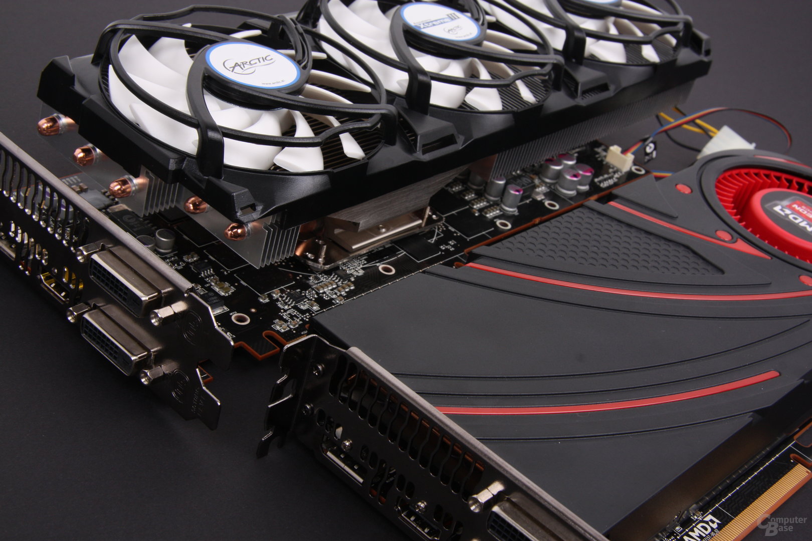 in foto una è la versione reference, diciamo standard di vga, l'altra è lo stesso modello che nn ha più il dissipatore standard ma monta un dissipatore triventola arctic, indicato a chi vuole fare overclock ma avere cmq temperature e rumore sotto il massimo controllo |
