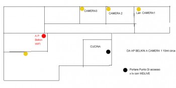 Di seguito una mappa sommaria per descrivere la situazione: Come potete capire la lan arriva in tutti i punti gialli (tra cui la camera1), e vorrei estenere il segnale del belkin; in questo caso posso usare un repeater o mi conviene prendere un access point usandolo in bridge. O usare powerline con wifi? Altra cosa sul punto nero (cucina) vorrei portare un punto d'accesso x connettere via lan il WDLive: in questo caso via Poweline? Dimenticavo: la lan è connessa alla rete tramite un Netgear DGND3300, a cui ho disattivato il wifi perchè risiede in uno stanzino in mobile rack dove scaldava parecchio e sistematicamente si impuntava...La rete è connessa tramite switch tplink gigabit cablata tutta in cat 5e... Spero di non aver fatto troppa confusione ed essermi + o - spiegato... Aspetto suggerimenti... Ultima modifica di fantonimanuel : 17-06-2014 alle 11:57. |