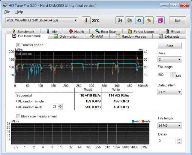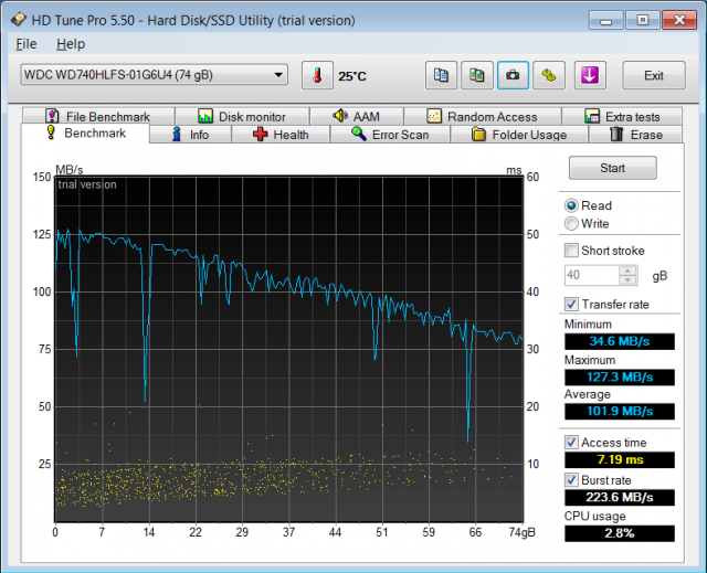Oh la, ora ci siamo..si si tutto bene, tempi di accesso molto bassi, classico per i WD Vel. e velocità nella media, niente da segnalare, qualche picco verso il basso ma vista l'età direi normale.