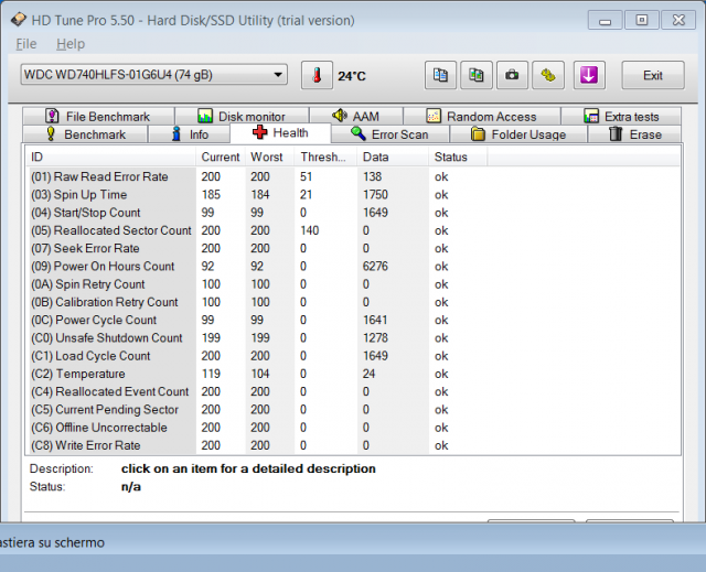 Puoi anche vedere cosa ti dice al riguardo, > HD Sentinel, è shareware, ma puoi usare la versione demo per 30 gg . Poi una volta provato, lo disinstalli con Iobit Uninstaller freeware, ti posto la versioni Portable, cosi non devi installarlo per usarlo http://portableapps.com/apps/utiliti...aller_portable Di HD Sentinel è interessante, a parte i dati Smart che chiaramente ci sono anche in questa applicazione alla voce Smart, la prima voce ossia Overview > è un riassunto sulle condizioni dell' hd . Se puoi postare un' immagine di HD Sentinel alla voce Overview Un saluto a HoFattoSoloCosi