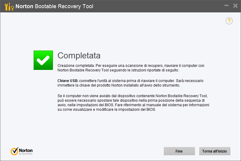 Norton Bootable Recovery Tool è uno strumento di soccorso disponibile gratuitamente a tutti. È possibile utilizzare questo strumento in situazioni di emergenza per ripristinare le normali condizioni di funzionamento del computer. È possibile utilizzare Norton Bootable Recovery Tool (NBRT) per eseguire scansioni e riparare eventuali minacce qualora si verifichino problemi nell'installazione dei prodotti Norton in seguito a un'infezione da virus del computer. Download: Norton Bootabile Recovery Tool Dopo aver eseguito NBRT-Retail-Downloader.exe partirà il download e l'installazione del tool vero e proprio. Il downloader serve infatti solo a scaricare i file necessari alla creazione del tool dai server della Norton. Una volta terminata l'installazione, appare la schermata della procedura guidata tramite cui potete creare il dvd o il file ISO da masterizzare con il vostro programma di masterizzazione o la chiavetta usb bootabile (attenzione se scegliete la pendrive i dati in essa contenuti verranno cancellati). La pendrive ha però il vantaggio di poter in seguito aggiornare le definizioni dei virus e quindi di tenerla sempre aggiornata senza rifare di nuovo tutta la procedura di creazione. ![]() Scegliendo di creare la pendrive bootabile apparirà questa schermata. ![]() Andando avanti verrete avvertiti che la creazione della pendrive richiede la formattazione e la conseguente perdita dei dati nella pendrive. Questa è la schermata che vi indica l'avanzamento della procedura di creazione della pendrive bootabile. E' un po' lenta la procedura anche con una connessione adsl. ![]() Al termine della creazione della pendrive apparirà questa schermata. ![]() Requisiti di sistema per l'utilizzo del tool: Microsoft Windows XP con Service Pack 2 o 3, Windows Vista, Windows 7, Windows 8 o Windows 8.1. RAM: 1 GB minimo. Per il funzionamento di Norton Bootable Recovery Tool su un dispositivo USB (nel caso si decida di creare un pendrive bootabile), il computer deve supportare l'avvio da USB. Fonte originaria : Alta Gradazione Licenza: Le informazioni contenute in questo messaggio sono rilasciate sotto licenza Creative Commons