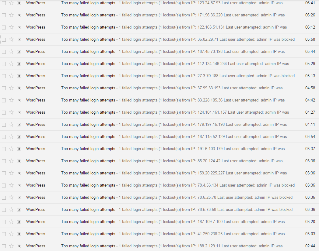 In pratica qualcuno sta tentando di loggarsi utilizzando come nome utente admin e provando password a caso! Sono venuto a conoscenza di questo grazie ad un plugin che mi invia una mail ogni volta che qualcuno tenta di loggarsi e sbaglia password, ora dopo 1 solo tentativo l'IP viene bloccato, ma l'attacco sta continuando! Ovviamente i tentativi avvengono tutti da ip diversi e si susseguono abbastanza regolarmente ogni 10 minuti. Cosa posso fare? Vi lascio uno screen http://ibin.co/1zsEC2moXQLI