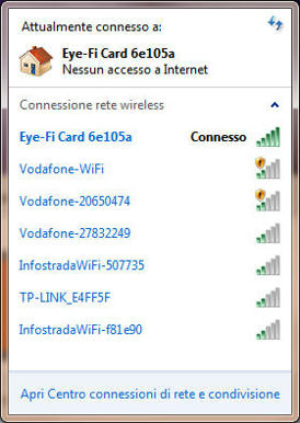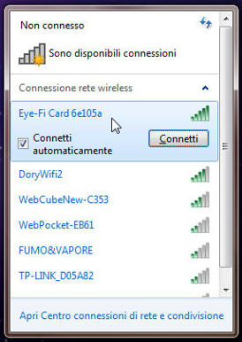 E questo va bene, molto bene. Bravo Master. Solo che ogni volta c'è la rete ma non è connessa e per connetterla devo sempre premere il pulsante connetti. Ciò dipende da windows 7 , o dal software che regola il wifi tra scheda SD e l'antenna wifi del laptop? Perchè voglio fare che la connessione scheda SD -laptop ci sia sempre quando la fotocamera è su 'on'. |