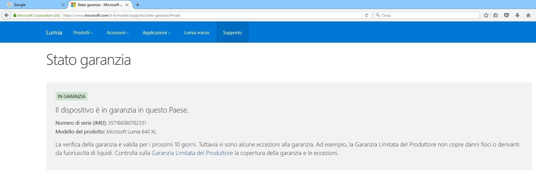 Ciao è ancora in garanzia tramite IMEI verificabile su sito Nokia-Microsoft, in caso di problemi (ho personalmente sperimentato la cosa con un 830) compili un form on line o via chat con operatore ed apri RMA con ritiro e riconsegna del terminale in pochi giorni