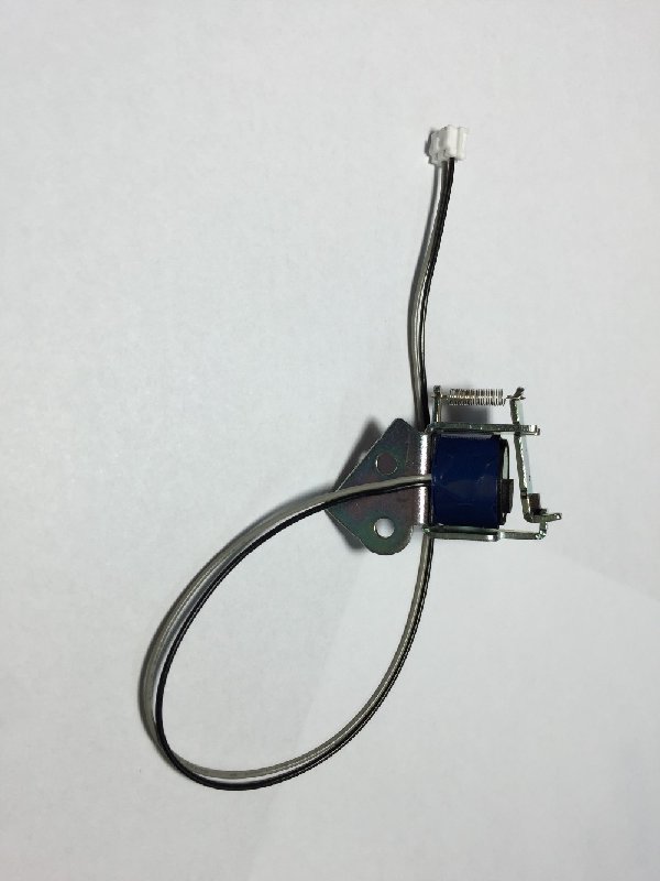 Non ho sostituito la molla in quanto non ne avevo al volo altre a disposizione, ma mi sono limitato in sostanza ad accorciarla, agganciandola direttamente sulle spire a poco più di metà della lunghezza. La molla originale in effetti sembra troppo debole per questa applicazione. Vedremo se durerà. Allego un'immagine di un solenoide analogo con la sua piastrina che va bloccare il meccanismo di raccolta della carta, per mostrare bene la molla se dovesse servire a qualcun altro.