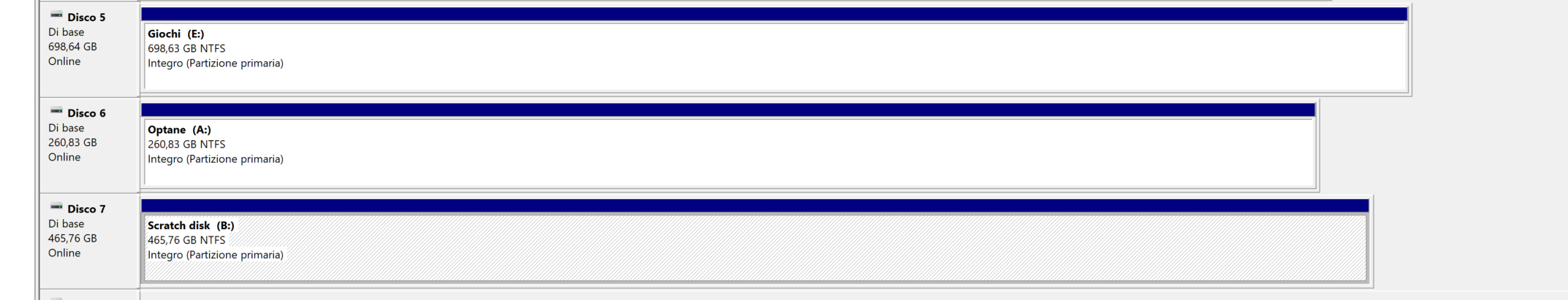 La mia attuale configurazione che vorrei risistemare è : 1 SSD 120 Gb x SO liberi 23 gb/118 2 SSD 500 gb x Programmi liberi 426/476 3 HDD 300 gb x Downloads liberi 4,3 gb/298 4 HDD 700 gb x giochi liberi 55 gb/698 5 HDD 1 TB x Dati vari liberi 55 gb/698 6 HDD 4 TB x Archiviazione liberi 55 gb/698 7 SSD 500 gb nuovo 8 SSD Optane 260 gb nuovo Ecco come appare il disco nuovo da 500 gb ... ![]() Il primo problema che ho è che l'unità di ottimizzazione ( deframmentazione etc ) riconosce il nuovo ssd come un HDD? Per quale ragione? Poi vorrei spostare il SO su un nuovo SSD o quello nuovo Optane o comprarne magari uno nuovo adatto . In pratica io col pc ci gioco e lavoro con la grafica , da photoshop a 3dsmax ed altri programmi , come mi conviene ridividere , spostare o organizzare i vari programmi o SO sui vari Hdd / Sdd?