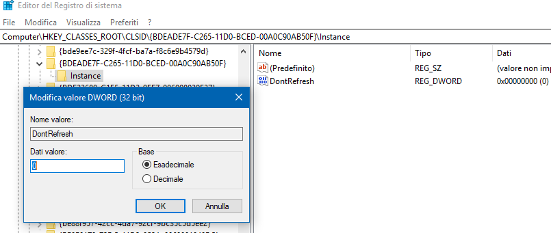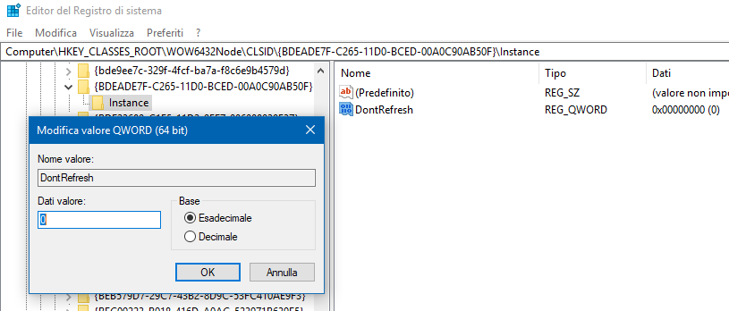qui HKEY_CLASSES_ROOT\CLSID o qui HKCR\Wow6432Node\CLSID\ (e in quest'ultimo caso il dword a 64 bit o sempre a 32)? e se provo a crerla dice