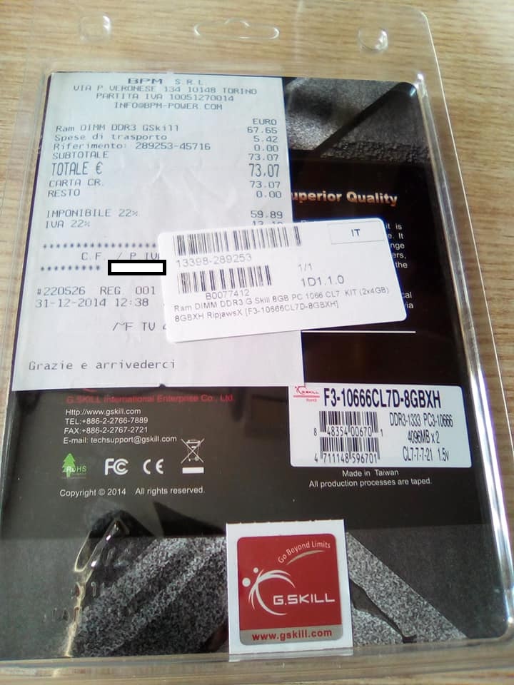 [Genzano di Roma + sped.] 8GB di RAM DIMM DDR3 G Skill PC 1066 CL7 KIT (2x4GB)