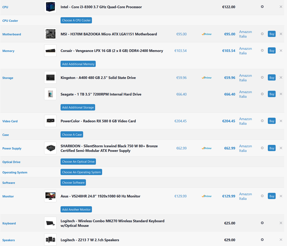 Volevo spendere al massimo 1000euro includendo tutto! Ossia schermo,tastiera,mouse,casse e cuffie Ho già scelto quasi tutto ma sono indeciso su processore-scheda madre Niente oveclock Vorrei una piattaforma mini-ITX o micro-ATX per far qualcosa dalle ridotte dimensioni. ![]() Sono incerto tra i3-8300 e Ryzen 5 2600 L'I-8300 in molti giochi a 1920 x 1080 è più performante ma il costo di una scheda madre di formato ridotto è molto elevato. Mentre il r5 2600 è un pò più caro come processore ma più versatile ed il costo delle schede b450 micro e mini sono più accessibili. Il ragazzo non ci farà editing o altro. Lo userà per giocare e browsing web. Un'altro dubbio che ho è meglio una RX 580 8gb o una 1060 6gb? Il case che su part picker non c'è Noua Utopia F5 o F7 Black