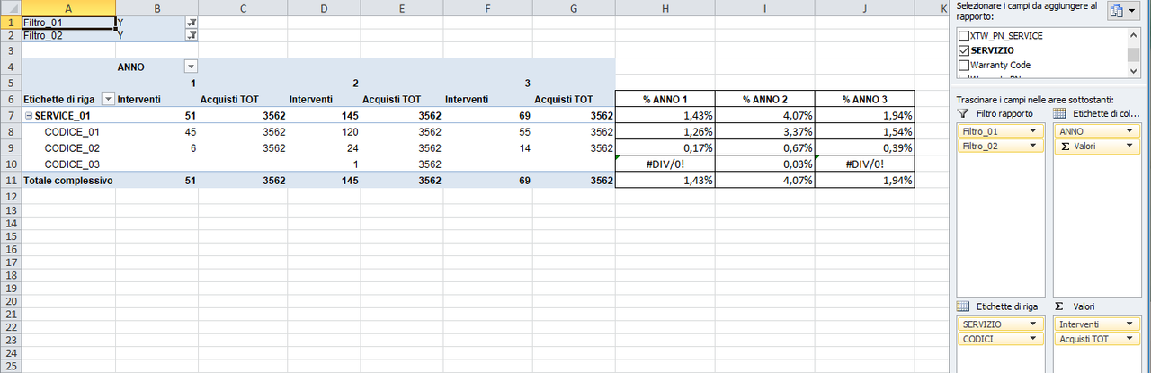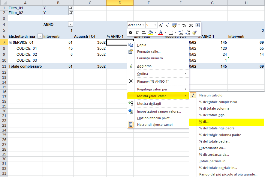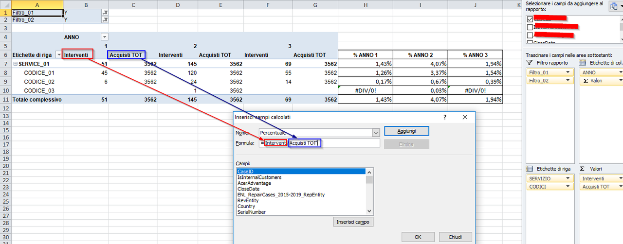 ho la seguente pivot in excel e mi serviva inserire un campo calcolato interno alla stessa che per ciascun anno che mi visualizzi il rapporto tra Interventi e Acquisti TOT. Potrei risolvere inserendo una formula come in colonna H,I,J ma quest'ultima, al variare della pivot, non si adatterebbe automaticamente. ![]() Sembrerebbe che l'utilizzo di un campo calcolato potrebbe essere la soluzione: ![]() ma la formula sembrerebbe errata. C'è anche la possibilità di visualizzare come percentuale di un altro valore: ![]() ma non sembra funzionare. Potreste aiutarmi? Grazie