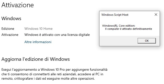 In base all'articolo indicato: https://www.hwupgrade.it/forum/showp...&postcount=257 la mia licenza di WS 7 probabilmente è di tipo OEM SLP, in quanto il product-key trovato a suo tempo con progammi gratuiti come ProductKey, Enchanted Keyfinder, ecc..è risultato diverso dal product-key scritto nell'adesivo nel retro del portatile. Però, dopo l'aggiornamento da WS 7 a WS 10, la licenza è stata rinominata in: Retail Channel, v. immagine ottenuta con il comando: SLMGR.VBS /DLI, probabilmente per il seguente motivo:" RETAIL CHANNEL:... il supporto è dato direttamente da Microsoft", come spiegato dettagliatamente in quest'articolo: https://answers.microsoft.com/it-it/...2-60ae296e3ed1 photo hoste confermato anche nell'immagine relativa al comando: slmgr.vbs -dlv, già inserita nel messaggio di ieri. Come avevo già scritto nel primo messaggio del 25.2, la licenza di WS 10 è attivata definitivamente (riporto anche qui, per comodità l'immagine realizzata pochi minuti fa con il comando: slmgr.vbs -xpr, e la finestra relativa a: Impostazioni / Aggiornamento e sicurezza / Attivazione): ![]() Desideravo chiedervi se il problema potrebbe risolversi installando l'aggiornamento alla nuova versione di WS 2004 che uscirà a Maggio, oppure, se rimarrà tutto come adesso. Ultima modifica di zoltec : 28-03-2020 alle 10:00. |