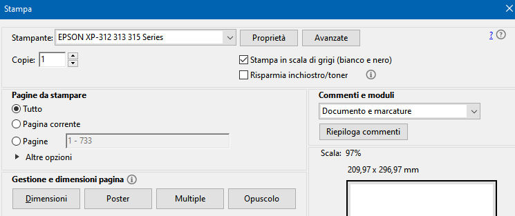 ![]() Edit: ho dato per scontato (magari sbagliando) che normalmente apri e stampi i .pdf con Acrobat Reader: con altri software quell'opzione non c'è o la finestra è diversa