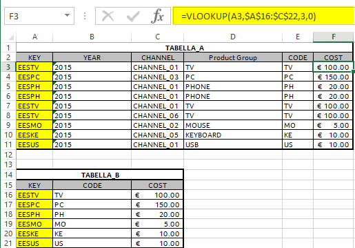 Invece se le tabelle sono come a seguire: ![]() Come faccio a inserire il valore COST all'interno della TABELLA_A in funzione del valore CODE che corrisponde al campo della TABELLA_B? Mi servirebbe una query select che funziona come il cerca verticale evidenziato Grazie
