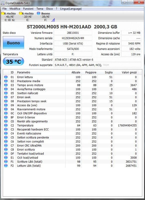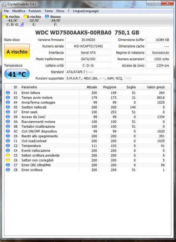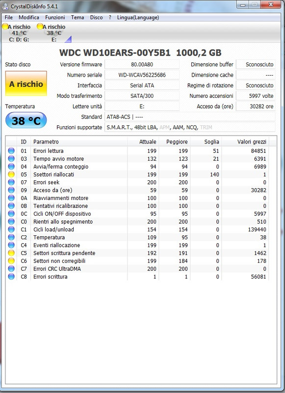 ciao se vedi questo disco e messo peggio guarda, se non mi sbaglio ho visto che le seguenti voci tendono ad aumentare, partendo da 0 su volere grezzi 05 settori riallocati C5 settori scrittura pendenti C6 settori non correggibili ![]() confrontando un disco esterno nuovo ho notato questa cosa