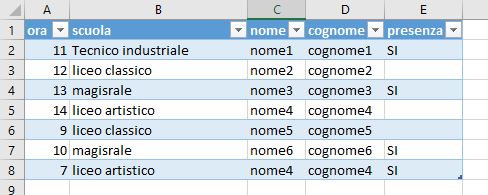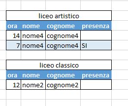 avrei bisogno di una dritta su excel.. ho una tabella con 5 colonne ora, scuola, nome, cognome, presenza 11 industriale giuseppe iaria SI 12 liceo paolo sitrace SI 13 magistrale pietro bozzo NO 14 artistico michele santerini SI 9 liceo antonio manti SI 10 magistrale aldo trani NO 7 artistico anna gallo SI vorrei fare in modo che (in un altro foglio) vengano generate una tabellina per ogni alunno es: industriale 11 giuseppe iaria SI come posso fare? mi interessa che per ogni alunno ci sia la scuola in alto e se l'alunno fa più lezioni in quella scuola nella tabellina ci siano più righe grazie in anticipo a chi mi aiuterà