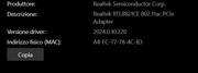 Ho un notebook HP modello 15-cs2023nl che a suo tempo quando l'avevo comprato avevo visto tra le varie caratteristiche che la scheda di rete era una Realtek RTL8821CE 802.11 b/g/n/ac (1x1) and Bluetooth® 4.2 Combo. Inserisco il link delle carattteristiche https://support.hp.com/it-it/document/c06265072 Se vado in gestione dispositivo in effetti mi appare come una 802.11ac, ma ho notato che scaricando in wifi non vado oltre i 300Mbps. Col cavo vado intorno ai 960Mbps. Così guardando nelle proprietà avanzate mi è apparso all'occhio che appare come dicitura 802.11n Qualcuno può spiegarmi se è una AC o una N ? Oppuresbaglio qualcosa io nei driver? Guardando sul sito HP è l'ultima versioen, mentre non riesco a recuperare sul sito realtek l'ultima versione. Scusate ma sono un pò (tanto) profano in materia. Grazie! allego foto screen della scheda ![]() ![]()