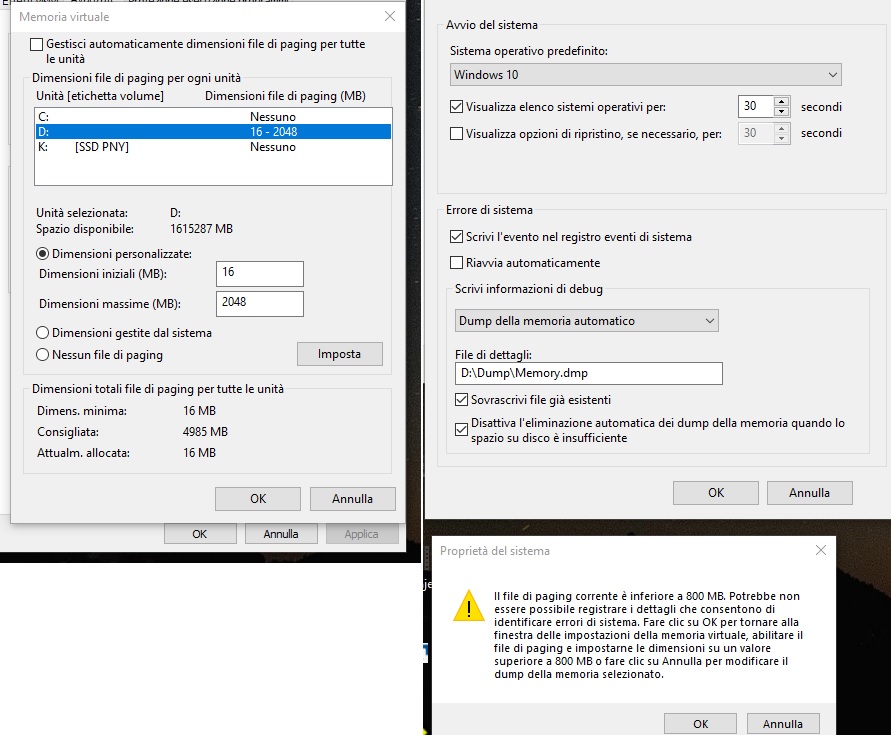 Non capisco quale sia il problema, ho messo una dimensione iniziale di 16 e una massima di 2048 (2gb) ben superiori agli 800mb richiesti sulla lettera D: in quanto non voglio usurare l'ssd..