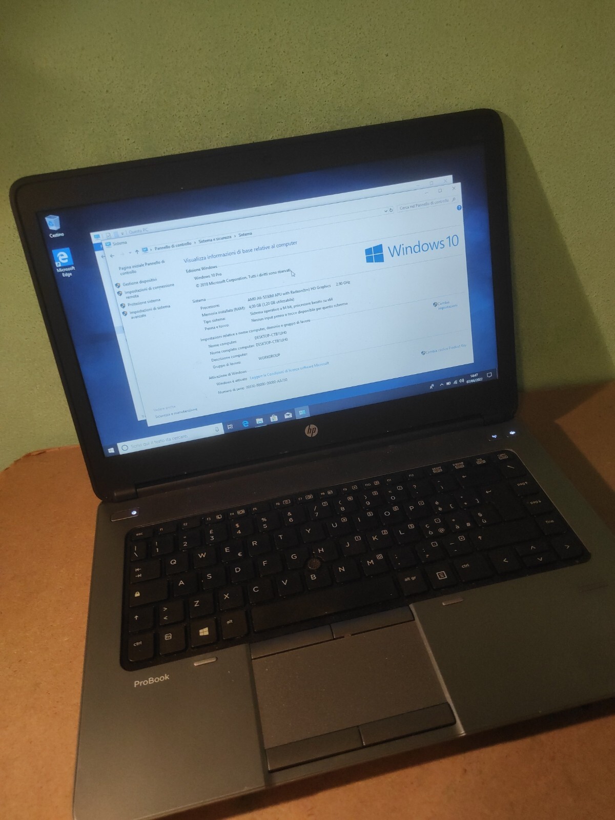 HP Probook AMD 645 G1 AMD A6-5350 HD 500 sata (normale) RAM 4 Gb Win 10 pro originale installato La batteria usata ma con ottima tenuta Il computer funziona bene testato. PREZZO 100 EURO