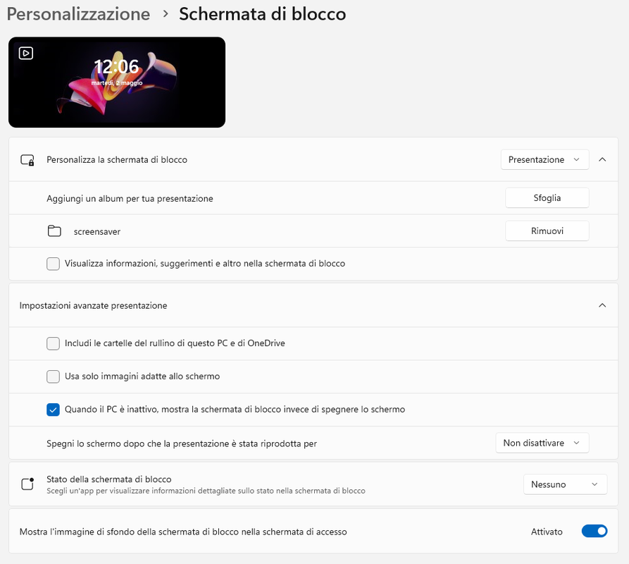Quello che vorrei ottenere: dopo x tempo il pc va in lockscreen facendo partire lo slide delle immagini e alla pressione di un tasto o movimento del mouse, mi riporta al desktop SENZA chiedere la password o il pin di accesso Quello che fatto: impostato uno screensaver selezionando "nessuno", con un'attesa di 10 minuti e la spunta "al ripristino torna alla schermata di accesso" configurato la lockscreen per mostrare una gallery di immagini da una determinata cartella ![]() Quello che ottengo: dopo 10 minuti di inattività parte lo screensaver "finto", mi porta in lockscreen e inizia lo slide delle immagini, se risveglio il pc però mi viene chiesto il pin di accesso Il problema: possibile non ci sia un modo "umano" per non avere la richiesta del pin ogni volta che dalla lockscreen torno al desktop? Il perchè: alchè capisco che sorgerà una domanda più che legittima: "ma perchè diamine vuoi portare il pc alla lockscreen se poi non vuoi il pin?" semplicemente perchè non ho trovato (non esiste?! ) un cavolo di screensaver, un minimo configurabile, che mostri un mosaico (ebbene si voglio proprio un mosaico