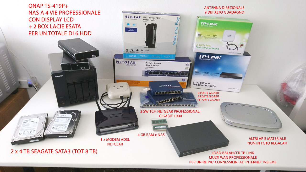 ![]() Vendesi in blocco nas, switch routers per realizzare un'impianto di sorveglianza completo (vanno aggiunte solo le telecamere ip, ma volendo si possono usare anche delle webcam usb). Ottimo per realizzare un impianto remoto di sorveglianza e rete per case al mare, montagna, campagna visto anche il router multi wan professionale e il resto dell'apparecchiatura. Tutto il blocco è così composto: - NAS CON SUPPORTO PER 4 HDD QNAP 419P+ PROFESSIONALE (valore di mercato: 400€) - 2 DISCHI SEAGATE DA 4TB L'UNO (valore: 80€ cad) - 2 BOX ESATA PER PORTARE IL TOTALE DEI DISCHI GESTIBILI A 6 (valore 15 € cad) - 2 SWITCH NETGEAR GIGABIT GS108GE da 8 PORTE (valore 60€) - 1 SWITCH NETGEAR GIGABIT GS116GE da 16 PORTE (valore 70€) - ROUTER PROFESSIONALE LOAD BALANCER TP LINK PER UNIRE PIU' CONNESSIONI DI RETE WAN, AD ESEMPIO ADSL+FIBRA+4G/5G TL-R470T+ (valore 39€) - ANTENNA DIREZIONALE TPLINK 9DBI TL-ANT2409A (valore 36€) REGALO INSIEME - 4GB RAM SODIMM - 2 ROUTER MODEM AP ADSL2 - 1 AP NETGEAR e cavi rete VENDO A 300€ DOVEVA ESSERE UTILIZZATO PER REALIZZARE IMPIANTO DI VIDEOSORVEGLIANZA MA CAUSA RINUNCIA NON è PIU' STATO MESSO IN FUNZIONE QUINDI PRATICAMENTE TUTTO IL BLOCCO è PULITO E COME NUOVO. VENDO TUTTO IN BLOCCO PERCHE' HO BISOGNO DI LIBERARE SPAZIO Prezzo: 300 euro Inclusa spedizione regalata nel prezzo ~ rules ~ - Vendo solo ad utenti con feedback comprovato qui sul forum, no perdigiorno che cambiano account ogni 5 minuti e chiedono garanzie di questo o quell'utente con 0 post e provano a fare trattative solo via pm. Nel caso segnalo a moderatore. - No spedizioni a "tizio" residente a in una città quando mi ha pagato "caio" in un altra con la scusa che è il fratello, il cugino o altro.. se non siete i diretti destinatari della merce non mettetevi in coda spedisco a chi mi ha pagato, se sento puzza di imbroglio mi riservo la facoltà di contattare un moderatore e sospendere la vendita. - Quando vendo hardware multiplo si presume che il ricevente sia in grado di risolvere un piccolo problema come un cavetto da assicurare meglio e/o altro, io vendo hardware non un servizio di assistenza/montaggio quindi sta a voi sapere come fare funzionare i prodotti non al sottoscritto. - Code Brevi - Se in coda significa al mio prezzo - Se in coda specificate chiaramente a cosa siete interessati da subito, non è pensabile uscirsene dopo 5 altri post dicendo no, ma io volevo il blocco di questo e quello (per saltare avanti ad un altro che si è messo in blocco dopo di voi). - Precedenza al Blocco - Precedenza al Mio Prezzo Iniziale, se si paga il prezzo pieno inizialmente proposto si scala su in cima alla lista, in caso di + persone si va come al solito in ordine di reply. - Precedenza totale alla Spedizione: pensate sia strano? Mi viene + comodo in questo periodo incasinato preparare i pacchi e farli ritirare tutti insieme al corriere rispetto a muovermi per la città per fare vari scambi a mano. In pratica la consegna a mano è l'ultima spiaggia, se arriva un utente anche dopo parecchio che vuole la spedizione do la precedenza a lui.. qui lo scrivo e lo faccio presente nel primo post, se non vi va bene non mettetevi proprio in coda, grazie - Vendita a mano significa stessa citta' e stesso quartiere o anche detto "sotto casa mia", se devo buttare litrate di benzina per uno scambio spedisco.. automaticamente se siete in provincia vale comunque la spedizione.. - Se consegna a mano, contanti altrimenti se online pagamento anticipato con bonifico - Normalmente spedisco con sendabox, no raccomandata (costa quasi lo stesso e la roba si scassa) assicurazione su richiesta e a carico del compratore - Per le spedizioni la mia resposabilità sui pezzi finisce nel momento in cui impacchetto e spedisco, se poste o corrieri distruggono, rubano, incendiano la merce non ne sono responabile e' consigliata ma non obbligatoria l'assicurazione sui pezzi (pagata a parte come specificato nella nota precedente). - Eventuali RMA della merce (solo per prodotti in garanzia) in seguito all'acquisto sono a carico del cliente sia in termini di procedura che di spedizione e vanno inoltrati direttamente alla ditta produttrice, la mia responsabilità finisce al momento della chiusura delle trattative (che avviene prima di un eventuale spedizione del prodotto o consegna a mano). Tutta la merce venduta è stata testata e vi viene data funzionante! - Merce in vendita anche fuori dal forum, dunque e' possibile ritiri la vendita in qualsiasi momento, sara' mia cura aggiornare il topic frequentemente - A tutti i prezzi vanno aggiunte le spese di spedizione a meno che non specificato diversamente CONDIZIONI DI GARANZIA La normativa dell’Unione Europea prevede che anche i privati siano tenuti a fornire garanzia sugli oggetti in vendita, tranne che detta garanzia sia esplicitamente esclusa al momento della vendita. In conseguenza di detta normativa l’oggetto della presente inserzione è in vendita così com’è visto e piaciuto, SENZA NESSUNA GARANZIA ESPLICITA O SOTTINTESA, così come nelle precise condizioni descritte nell’inserzione, quindi chi fa l’offerta, accetta incondizionatamente ogni esclusione di qualsiasi forma di garanzia. PROTEZIONE CONTRO LE TRUFFE In seguito a tentativi + o - espliciti verificatesi nei forum di truffe da parte di compratori che acquistano pezzi identici a altri gia' in loro possesso ma danneggiati e al momento dell'acquisto segnalano malfunzionamenti (fasulli) sul pezzo comprato provando a rifilare il pezzo danneggiato al compratore e allo stesso tempo riavere i soldi spesi... sono costretto a rifiutare qualsiasi reso. La mia merce e' testata e funzionante (a meno di non avere specificato diversamente), inoltre e' venduta senza garanzia (a meno di non avere specificato diversamente. Ovviamente non posso offrire diritto di recesso in quanto trattasi di: vendita da privato esente da ogni garanzia, diritto di recesso, cambio o reso secondo le norme europee. ULTERIORE AGGIUNTA/CHIARIMENTO