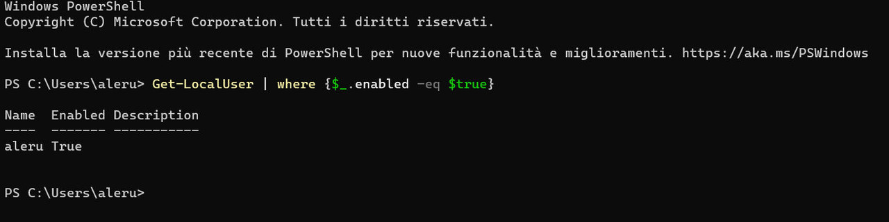 in cmd mi esce questo Administrator aleru DefaultAccount Guest WDAGUtilityAccount Esecuzione comando riuscita. il primo è il mio, quello funzionante che utilizzo ora non so se è questo "Guest WDAGUtilityAccount" il secondo che mi compare all'avvio.... |