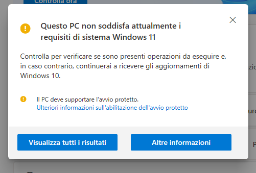 ho un PC recente (appena assembrlato) con CPU AMD Ryzen Mobo Asus B550-MK e 16 GB di ram Il PC Healt (tool Microdoft per verificare la compatibilità con Win 11) mi dice che c'è una caratteristica non compatibile con Win 11, l'avvio protetto. Sono andato nel Bios e ho abilitato il "secure Boot", ma continua a darmi lo stesso messaggio: ![]() Cosa posso fare? Grazie Ultima modifica di eleoluca : 22-07-2023 alle 18:03. |