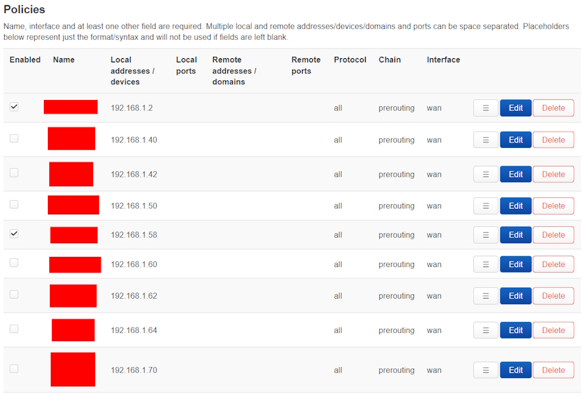 ![]() screenshot del mio pbr, vpn-policy-routing è praticamente identico. (nella tabella ho preparato impostati gli IP dei dispositivi di cui mi capita di switchare tra WAN e VPN). - Vuoi che il traffico di un dispositivo della LAN passi dalla WAN e non dalla VPN? Imposti l'IP di quel dispositivo in "local addresses/devices" e spunti "enabled" - Vuoi che il traffico della porta x di un dispositivo della LAN passi dalla WAN e non dalla VPN? oltre all'IP del dispositivo, aggiungi anche la porta interessata in "local ports" (solo il traffico di quella porta passerà dalla WAN, il resto dalla VPN). - Vuoi che in generale (per tutti i dispositivi della LAN) il traffico di un sito web passi dalla WAN e non dalla VPN? Imposti il dominio (es. hwupgrade.it) in "Remote addresses/domains" e spunti "enabled" (su questo però non ricordo se vpn-policy-routing sia in grado di farlo, probabilmente lavora con gli IP, quindi va ricercato ed impostato l'IP di hwupgrade.it) Nella parte bassa della pagina di configurazione di pbr/vpn-policy-routing trovi la zona "Custom" con già preimpostati dei servizi es. Netflix e Prime da poter escludere dalla VPN. Lì puoi aggiungere anche altro, c'è uno script che scarica l'intero range IP es. di disney, microsoft, rai, mediaset etc. etc. da poter escludere dalla VPN. |