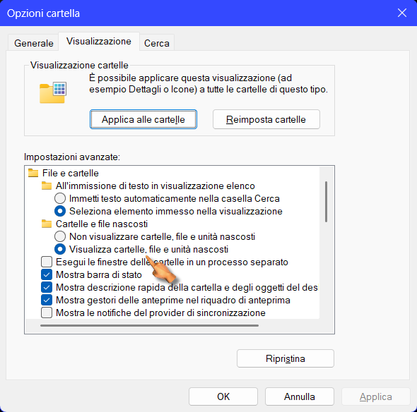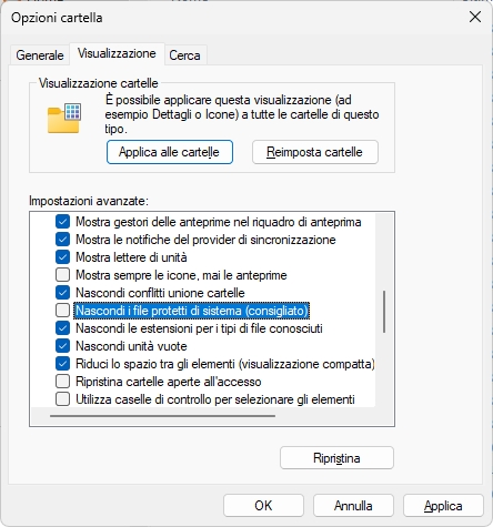 ![]() Quindi sono da impostare entrambe le opzioni per visualizzare i file nascosti di sistema. |