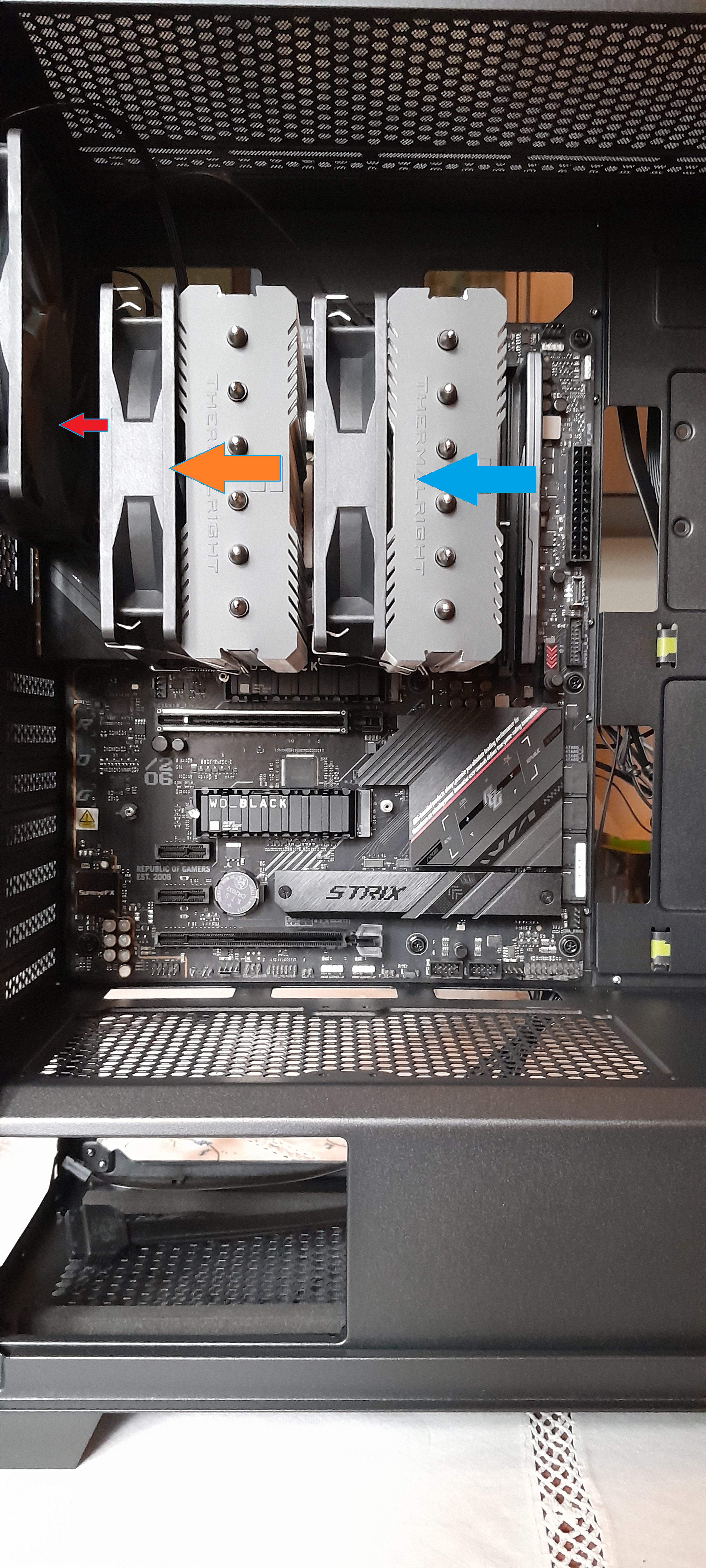 La ventola a destra (blu) aspira l'aria fresca dalla parte frontale del case e la spinge attraverso le alette del dissipatore, mentre la ventola a sinistra (arancione) continua a spingere l'aria calda verso la ventola posteriore del case (freccia rossa) che a sua volta la butta fuori dal case In questo modo, il flusso d'aria segue una direzione lineare: davanti → dietro, che è l'impostazione ottimale per il raffreddamento. |