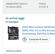 La mobo sembra che non sia mai stata montata e presenta solo una imperfezione estetica sulla scritta "Crosshair" dove copre la mascherina laterale (screen), deduco che il reso sia per questo motivo. Per il resto è perfetta e full bundle. Non sono riuscito a testarla e probailmente non potrò causa poco tempo, ma resta comunque valida la garanzia amazon a cui risponderò se necessario. Nel mentre era in spedizione ho optato per una diversa mobo. Visto il prezzo ottimo da me pagato (screen sotto) €517,61, vorrei ne lucrarci e ne perderci. Quindi vendo NON trattabile a €517,61 + spedizione. Ho tempo per fare il reso 14 giorni da oggi, ma se qualcuno del forum è interessato a risparmiare €100+ per un piccolo difetto estetico, sono felice di darla a lui. Pagamento in bonifico bancario (vendo da più di un decennio qui dentro e sempre affidabile) ![]() ![]() ![]() ![]() ![]() ![]() ![]() ![]()