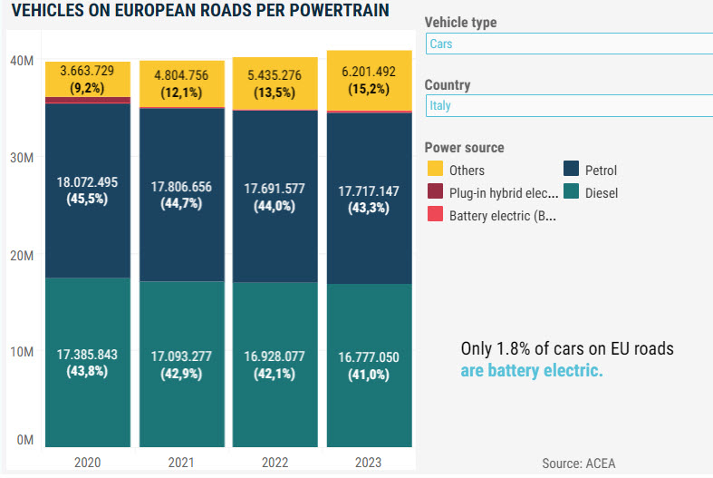 la Norvegia quindi aveva quasi un quarto di auto elettriche circolanti nel 23 grazie ad un parco auto piccolino. quindi la Norvegia è totalmente inutile nei messaggi che parlano di elettrico perchè conta come Città del Vaticano nel mondo automobilistico come sospettavo. mentre noi in Italia avevamo appena 200 mila auto elettriche in strada due anni fa (un terzo della norvegia) ma abbiamo anche un parco auto di 37 milioni di automobili che è 20 volte quello norvegese.. la Germania con il suo misero 3% di auto elettriche in circolazione surclassa di gran lunga la Norvegia con le sue misere 800 mila auto avendone all'epoca quasi il doppio. e nel 2023 appena il 2% dei veicoli erano BEV in Europa fra l'altro questi dati fanno anche capire quando sia irrilevante, nel cambiamento della qualità dell'aria, l'impatto delle auto elettriche.. è palese che quel 2% di auto elettriche non posso avere nessun impatto reale sui dati della qualità dell'aria contro le oltre 200 milioni di vetture non elettriche i dati sono ACEA e quindi non ho dubbi che siano veri grazie del link, interessante