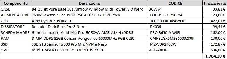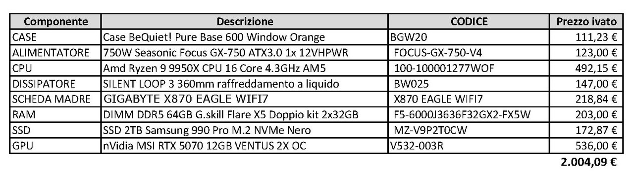 CASE Be Quiet Pure Base 501 Airflow Window Midi Tower ATX Nero BGW74 93,81 € ALIMENTATORE 750W Seasonic Focus GX-750 ATX3.0 1x 12VHPWR FOCUS-GX-750-V4 123,00 € CPU Cpu Amd Ryzen 9 9900X AM5 L2 100-100000662WOF 367,00 € DISSIPATORE Be quiet Dark Rock Pro 5 Nero BK036 99,41 € SCHEDA MADRE Msi Pro B850-P Wifi Socket AM5 AMD Ryzen 7E56-002R 215,50 € RAM DIMM DDR5 64GB G.skill Flare X5 Doppio kit 2x32GB F5-6000J3636F32GX2-FX5W 203,00 € SSD SSD 2TB Samsung 990 Pro M.2 NVMe Nero MZ-V9P2T0CW 172,87 € GPU nVidia MSI RTX 5070 12GB VENTUS 2X OC V532-003R 536,00 € TOTALE: 1.810,59 € |