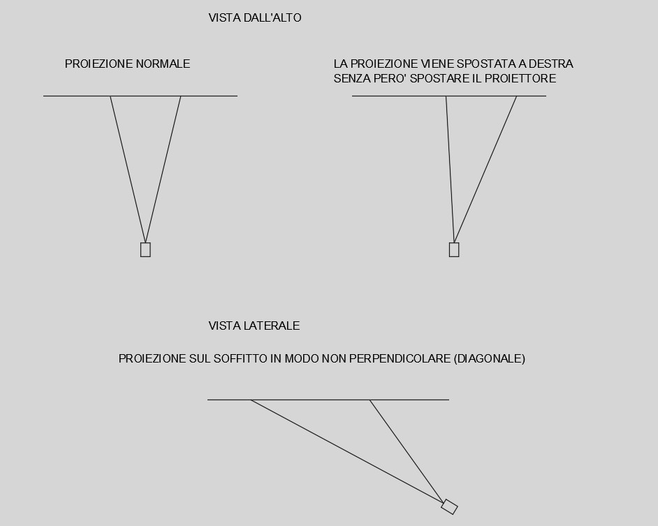 - Si può usare un proiettore come un secondo monitor? quindi poter estendere ma soprattutto clonare l'immagine o ancora meglio attivare il proiettore (diciamo monitor 2 nelle impostazioni windows) e spegnere monitor 1 - La qualità di immagine è come quella di un monitor? - Serve uno sfondo bianco? - Ci sono impostazioni per regolare la posizione dell'immagine? Ad esempio la distanza dal muro ma soprattutto distorcere l'immagine se la proiezione non è perpendicolare, sia laterlamente che verticalmente...qualche esempio nell'immagine sotto ![]() |