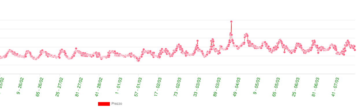 Esattamente quello di cui parlavamo in ufficio ieri. Fatto il pieno a 1.7 il giorno dopo vedo 1.9, a 12 ore di differenza, non credo che nel frattempo hai ordinato una autobotte e pagata 20 cent in più al litro. e il giorno dopo 1.999 che valore strano ! Spero che questi soldi gli usino per comprare imodium ! |
