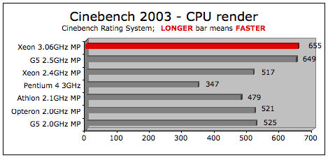nei test di barefeats, cinebench2003: ![]() il dual g5 2.5mp totalizza 649, è dietro al dual xeon ma di un nulla, praticamente è lo stesso risultato, e nel "how we test" dice che quello è un test di rendering. nei test di arstecnica (dove il dual g5 non viene confrontato con macchine pc), in particolare nel cinebench2003, il g5 ottiene questo risultato : dove il test di rendering con "multiple cpu" ottiene un decisamente più modesto 577, quindi ben dietro il dual xeon.... quindi è barefeats che ha truccato i bench, è arstecnica che li ha truccati, o semplicemente hanno fatto due test diversi(cinebench2003 non l'ho mai visto...)?