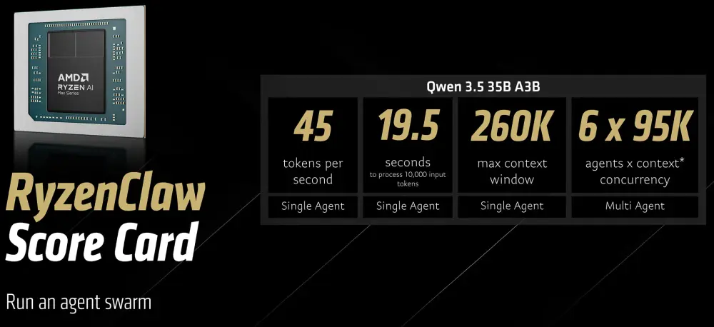 Il primo scenario prevede l'uso di una piattaforma basata su Ryzen AI Max+ con 128 GB di memoria unificata. AMD raccomanda di configurare 96 GB come memoria grafica variabile, così da offrire spazio sufficiente ai modelli linguistici. In questa configurazione OpenClaw può eseguire il modello Qwen 3.5 35B A3B, raggiungendo circa 45 token al secondo. AMD indica inoltre alcune capacità operative: