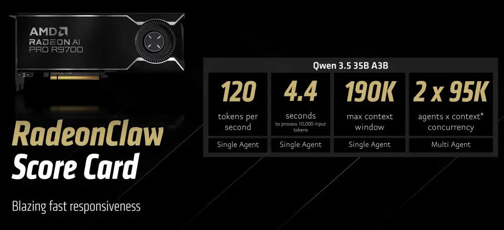Il secondo approccio, chiamato RadeonClaw, utilizza invece una GPU Radeon AI PRO R9700 dotata di 32 GB di VRAM. In questo caso il sistema risulta sensibilmente più veloce con lo stesso modello AI:
