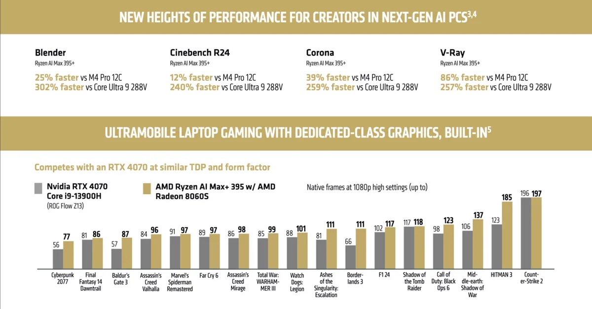 AMD Ryzen AI Max+ 395: nelle slide di AMD la iGPU è fino al 68% più veloce della RTX 4070 Laptop