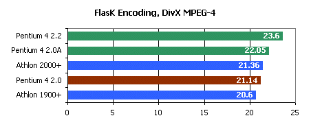 Nell'immagine sopra potete vedere l'esempio del bench FlasK encoding, in cui viene testata la velocità di compressione di un filmato DivX. Le prestazioni della cpu Intel sopravanzano nettamente quelle della cpu AMD, sopratutto grazie all'intensivo sfruttamento delle istruzioni SSE2.