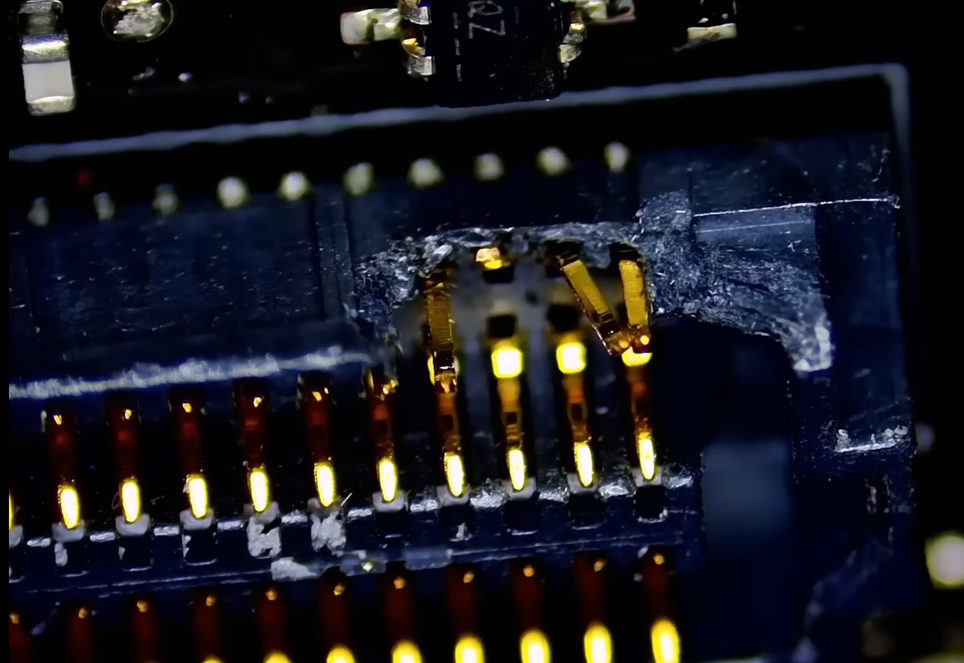 Il tecnico descrive la costruzione modulare a due sezioni come un punto debole, poiché "ogni giunzione aggiuntiva aumenta la possibilità di guasti". L’analisi mostra danni al connettore, probabilmente causati dall’installazione del sistema di raffreddamento alternativo, con il risultato che la GPU non invia più alcun segnale video.