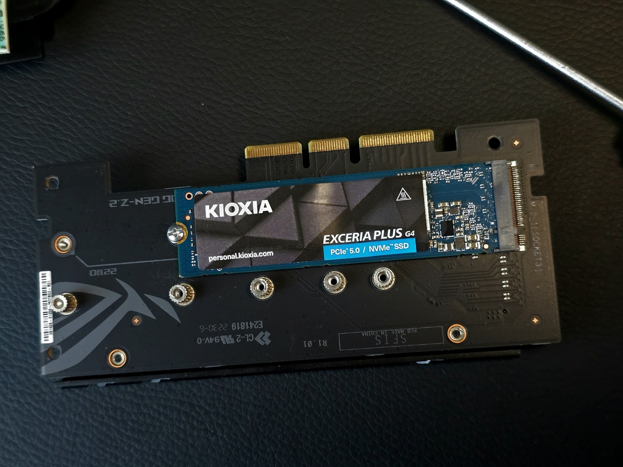 Abbiamo provato l'Exceria Plus G4 su una scheda madre ASUS ROG X670E Extreme sfruttando lo slot Gen-Z e la scheda fornita in dotazione. Come si evince dalle immagini, quindi, abbiamo avuto a disposizione un buon dissipatore, ma pur sempre passivo e dall’ingombro tutto sommato contenuto.
