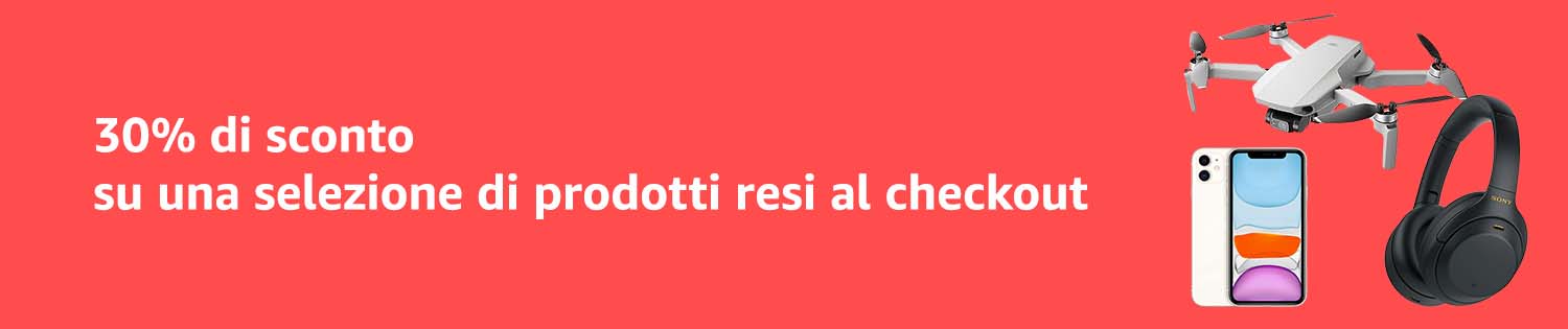 508,73€ Compra oraEcco alcuni esempi degli affari che si possono fare. Notiamo che c'è un piccolo problema su Amazon per quanto riguarda il banner sulla pagina di Amazon Seconda Mano che a volte mostra uno sconto del 30% mentre altre volte del 10%. Ma come potete verificare nella pagina di ciascun prodotto lo sconto è effettivamente del 30% vista la presenza della dicitura Risparmia 30% al check-out.